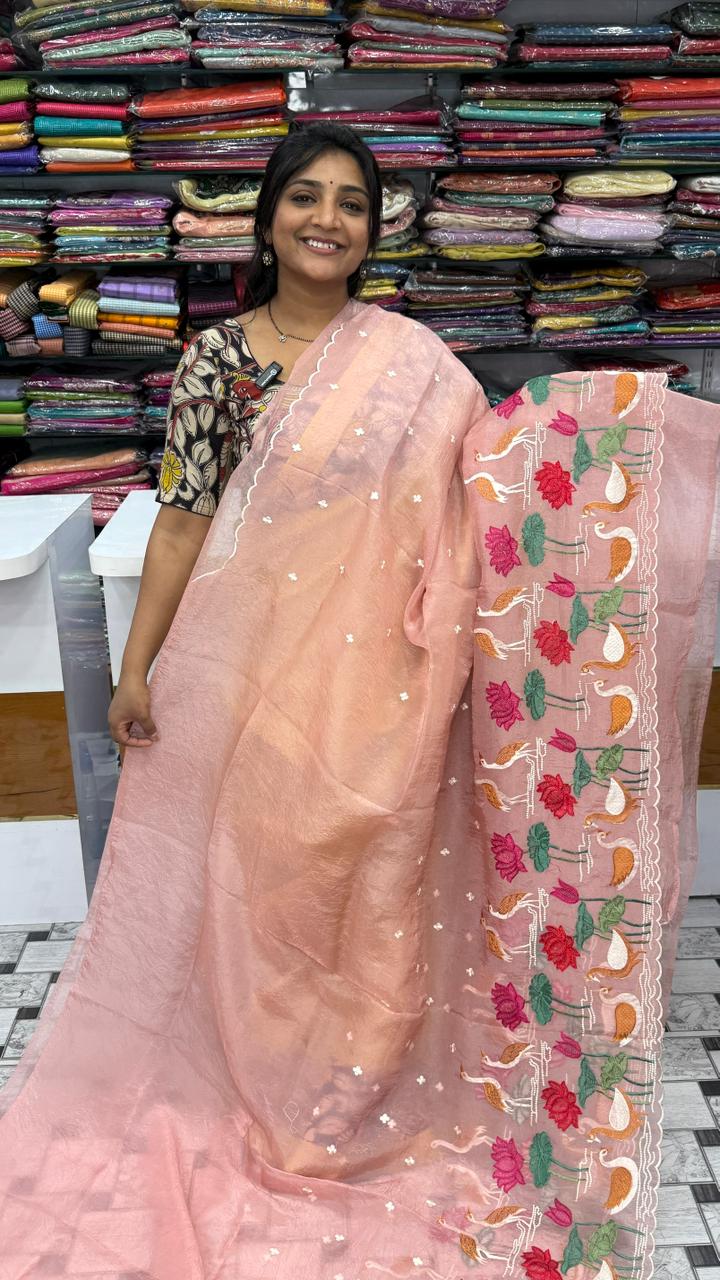 Crush tissue sarees combine delicate elegance with practical durability. Crafted from lightweight tissue fabric with a subtle crushed texture, these sarees drape beautifully while maintaining their shape throughout the day. The fabric's natural sheen enhances any complexion, making it ideal for both casual gatherings and formal occasions. Perfect for warm climates, crush tissue sarees offer comfort without compromising on sophistication. Their versatile nature allows for effortless styling with traditional or contemporary blouses.